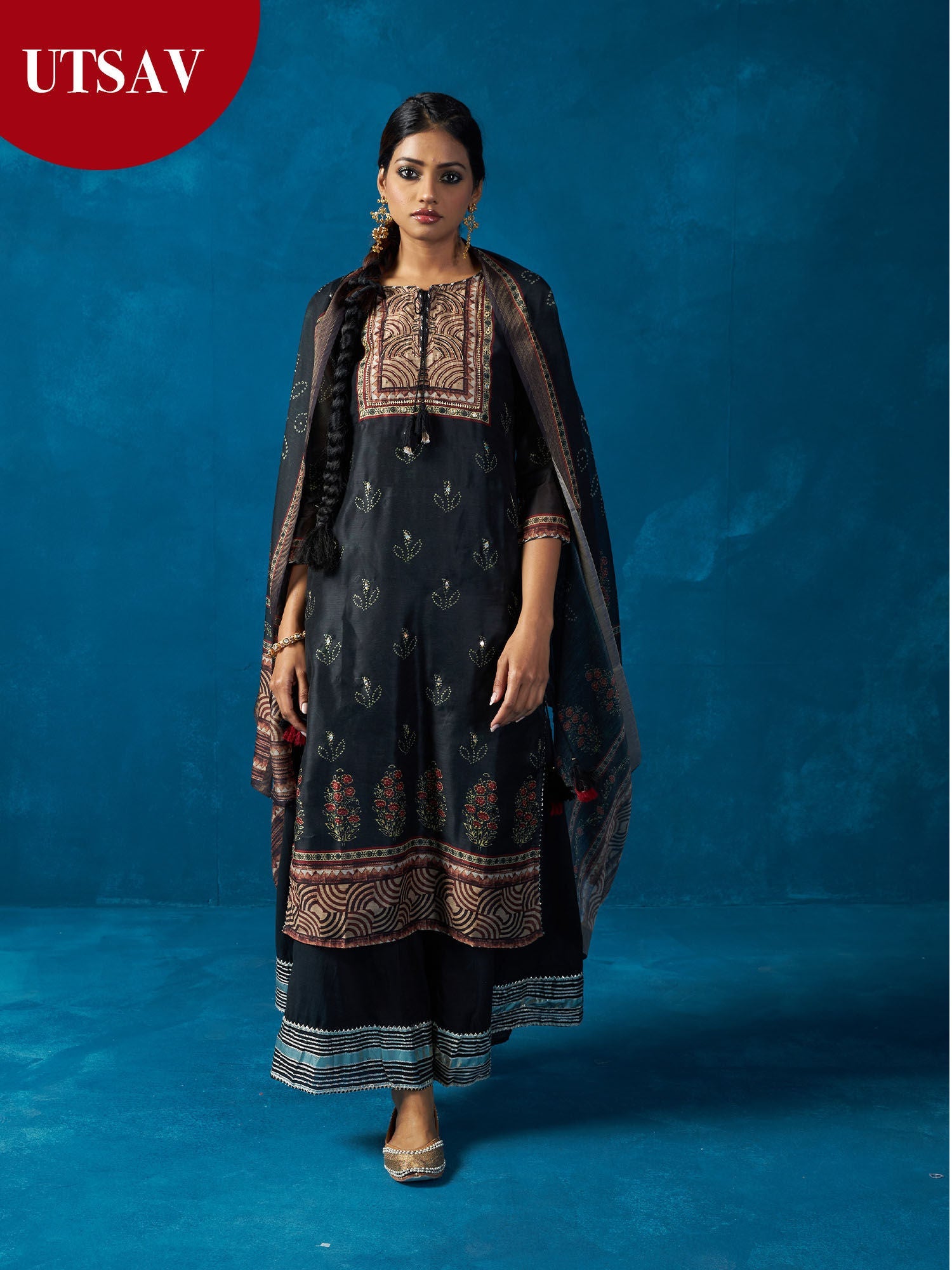 - The three-fourth sleeves, round neck, and printed pattern add a touch of sophistication. The set includes a kurta, sharara, and a matching dupatta for a complete and coordinated look.