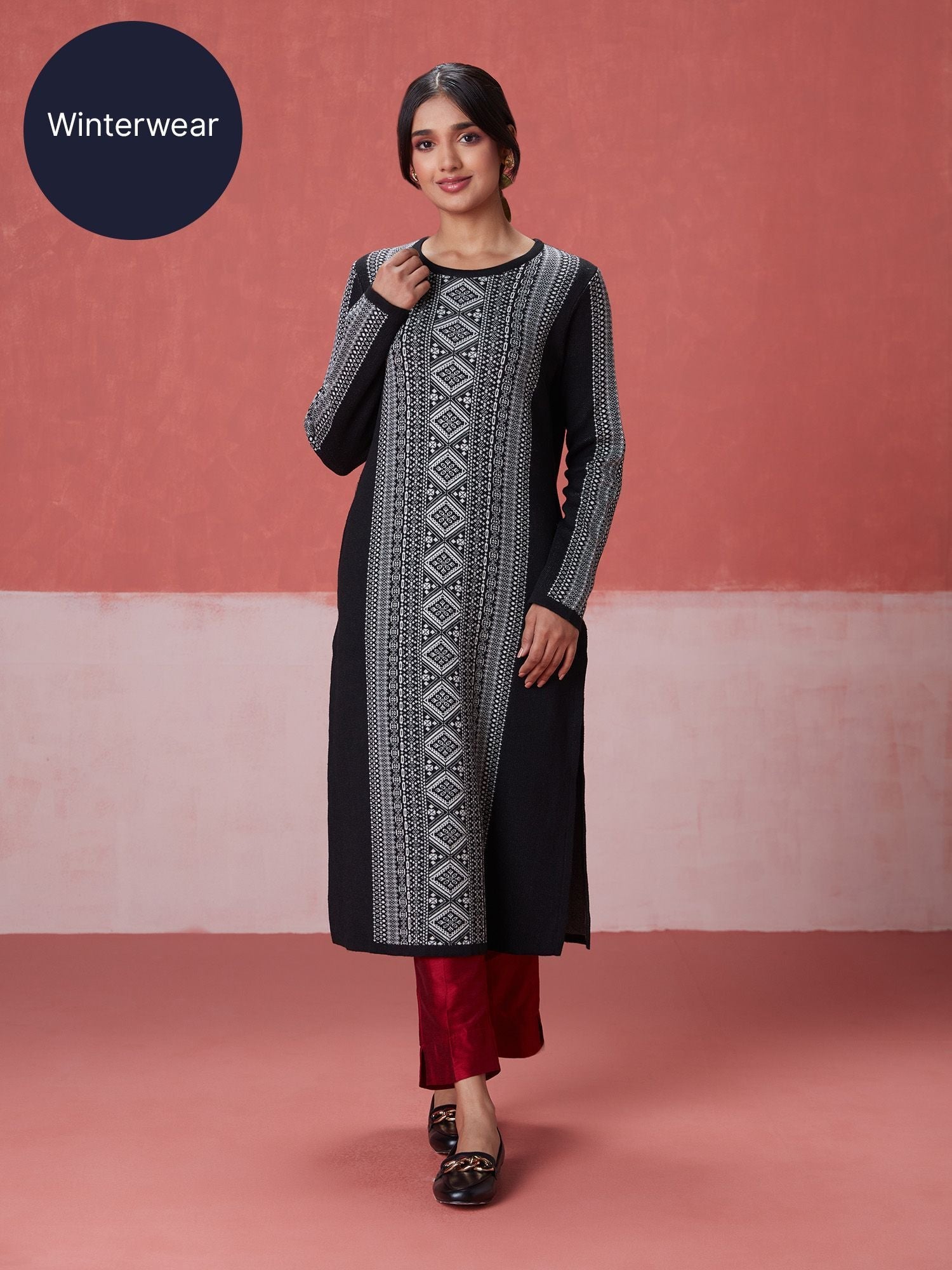 Likha Black Woollen Acrylic Jacquard Winter Kurta LIKWW05