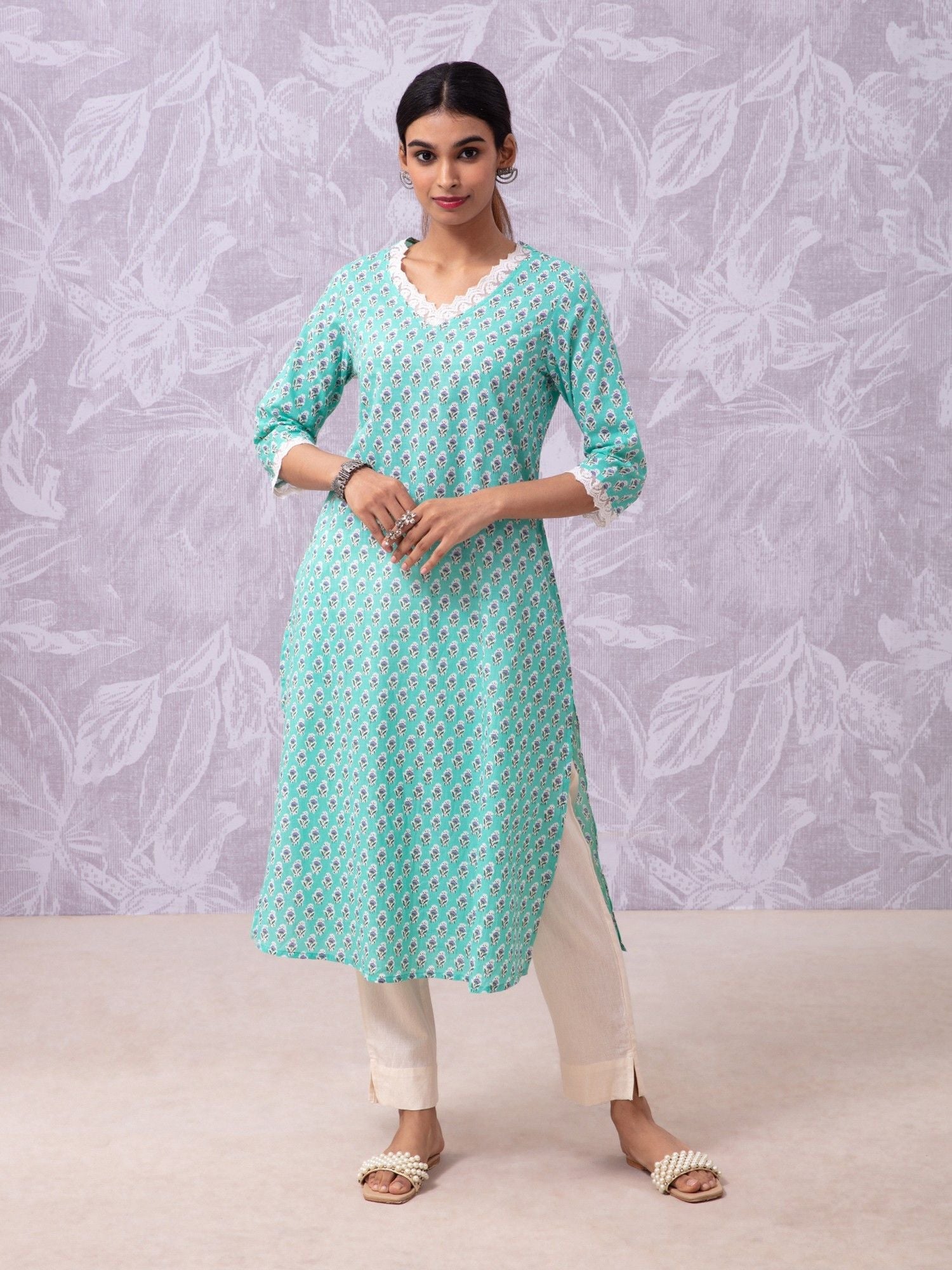- This casual printed cotton kurta is perfect for adding style and comfort to your everyday wardrobe. The V-neckline and three-quarter sleeves make it an ideal choice for casual occasions.