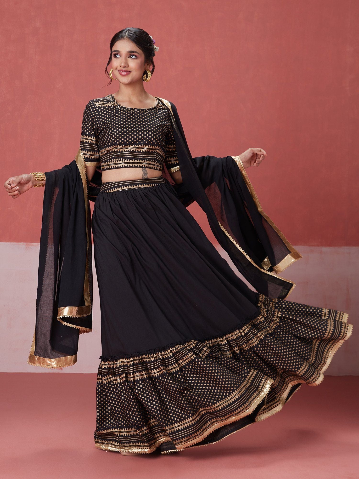 Likha Ghoomar Black Printed Tiered Lehenga Choli with Dupatta LIKLEH18 (Set of 3)