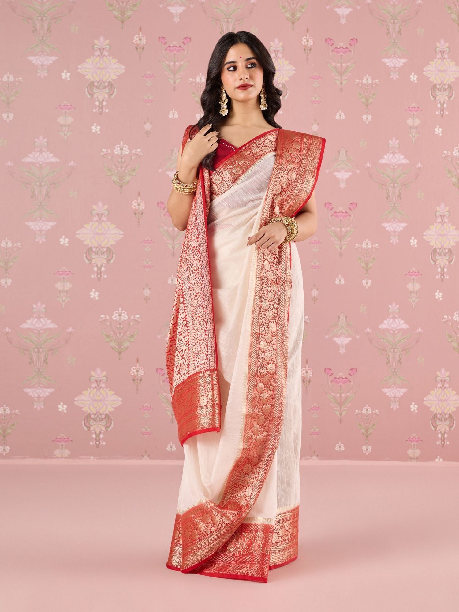 Likha Off White Karigar Korner Cotton Antique Zari Pujo Saree with Unstitched Blouse LIKKKSAR09