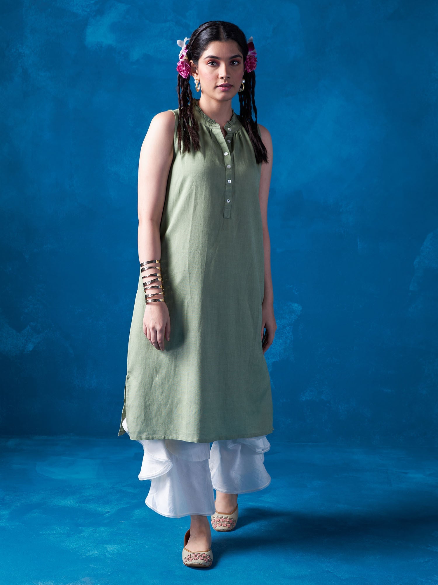 - Elevate your casual style with this comfortable and chic olive green kurta from Likha by Nykaa Fashion. Perfect for everyday wear, its solid design and sleeveless style offer a trendy and comfortable look.