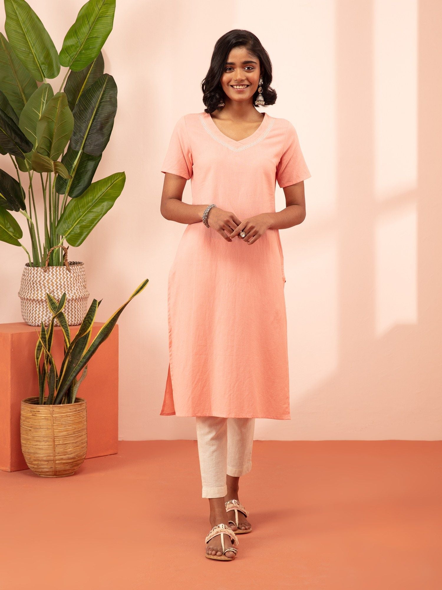 - Embrace casual charm with this Light Pink Cotton Flex Kurta, perfect for everyday wear. The kurta features a V-neck, a regular fit, and half sleeves, offering comfort and style. It boasts a solid/plain pattern with subtle and stylish Kantha work, making it a versatile choice for casual occasions.