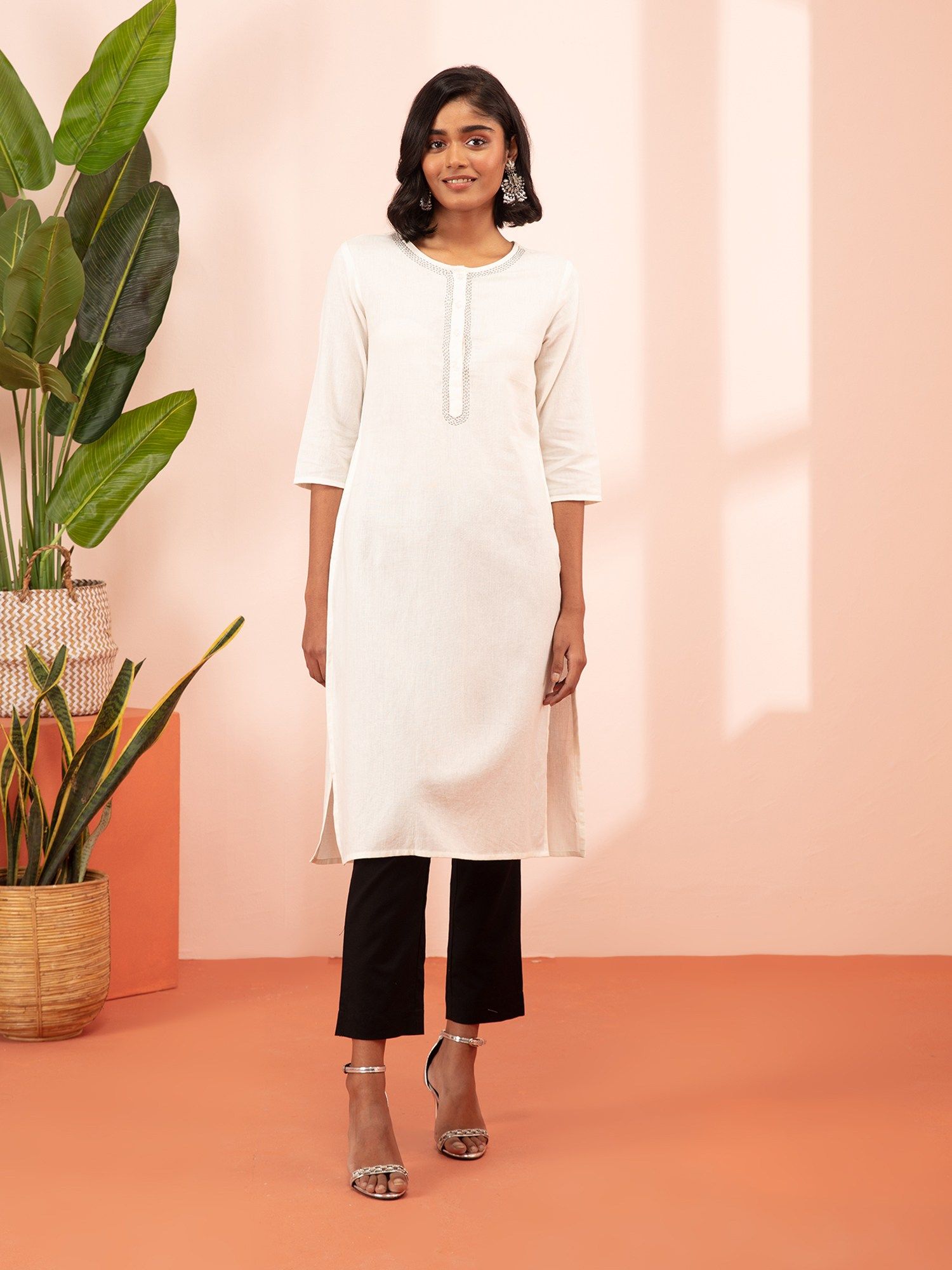 - Embrace casual elegance with this Cotton Flex White Kurta featuring subtle and stylish Kantha work, perfect for everyday wear. Crafted from comfortable cotton, this solid/plain patterned kurta is tailored for a regular fit, complete with three-fourth sleeves and a button fly closure.