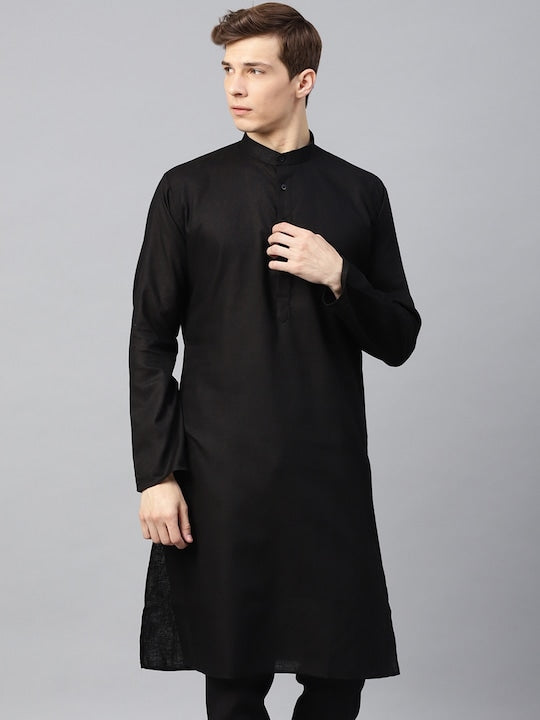 - Black solid straight kurta, has a mandarin collar, long sleeves, straight hem, and side slits