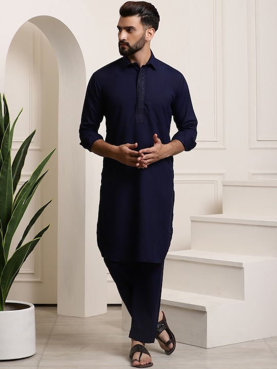 - Navy Blue solid Pathani knee length kurta, has a shirt collar, long sleeves, curved hem, concealed button placket, one chest pocket, two mock pockets on the side