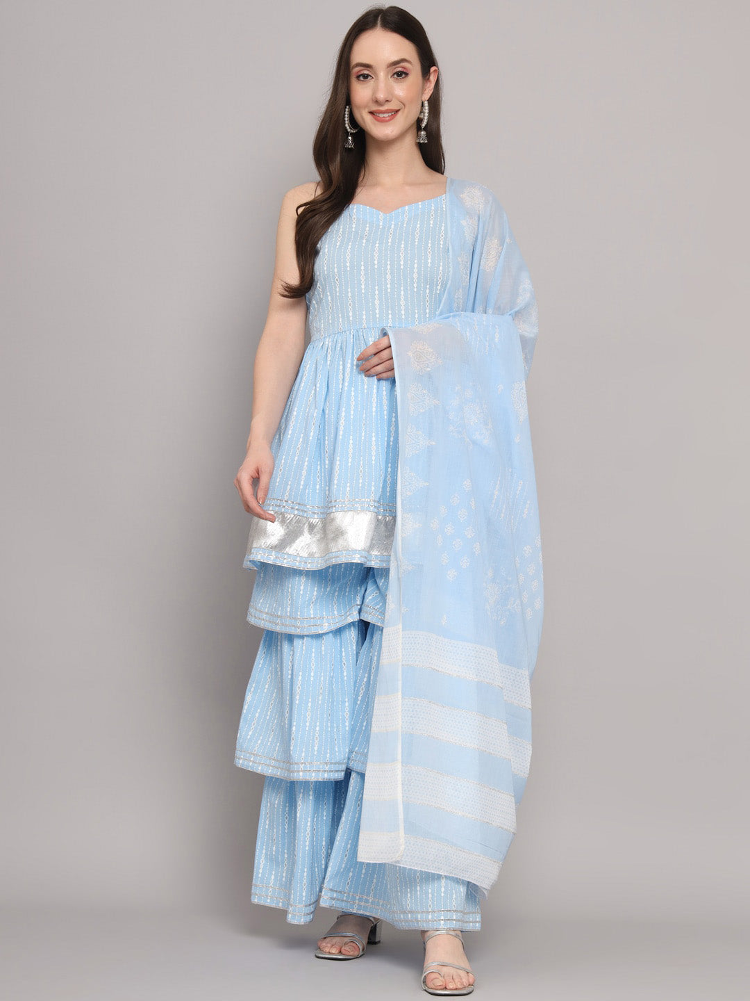 Myshka Ethnic Motifs Printed Pleated Anarkali Pure Cotton Kurta with Sharara & Dupatta