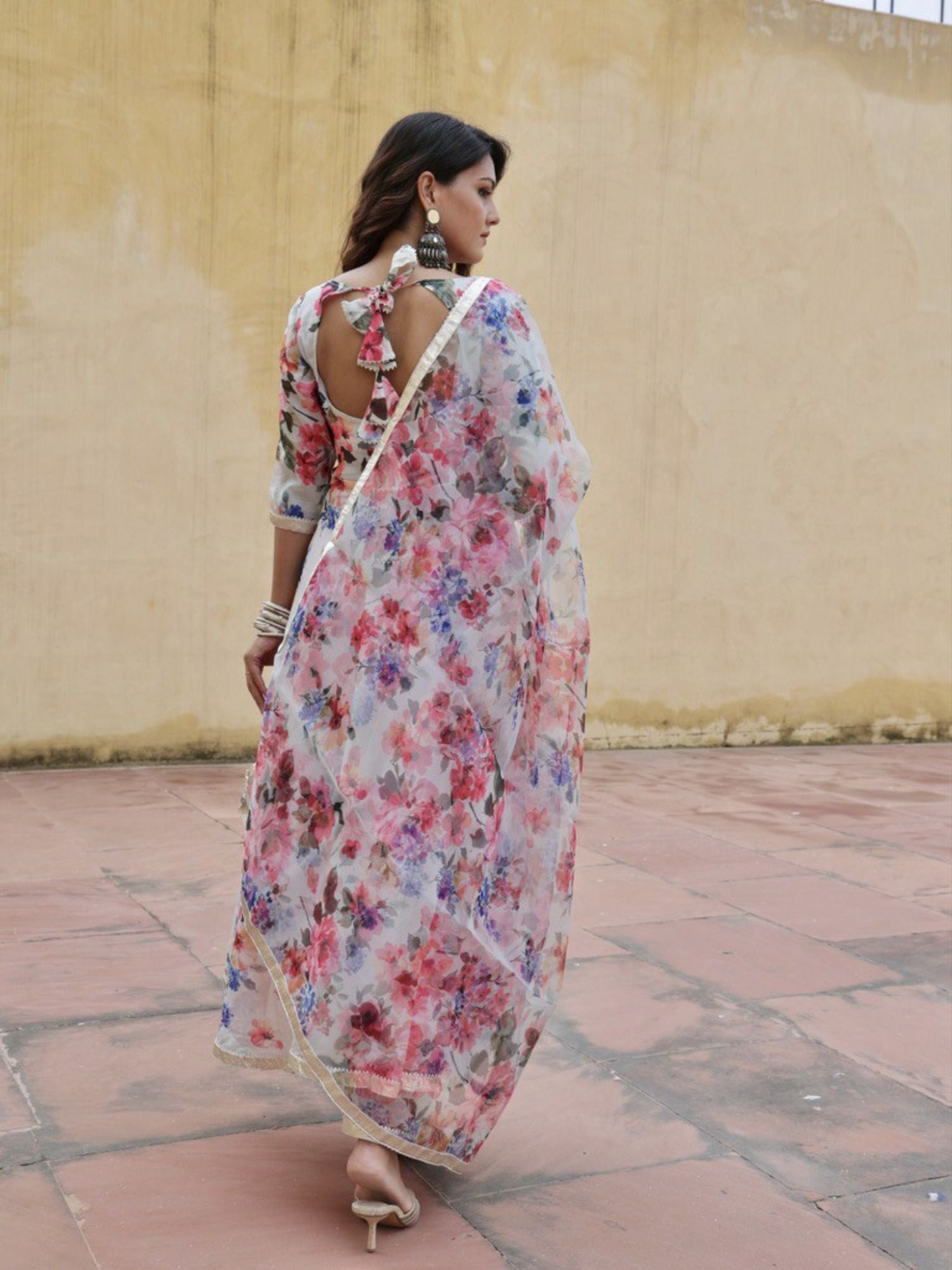 - This gorgeous floral print Chanderi Suit Set features a scoop neck, three-quarter sleeves, and a comfortable fit. The set includes a kurta, cotton pants, and an organza dupatta with gota work, offering an elegant look perfect for various occasions.