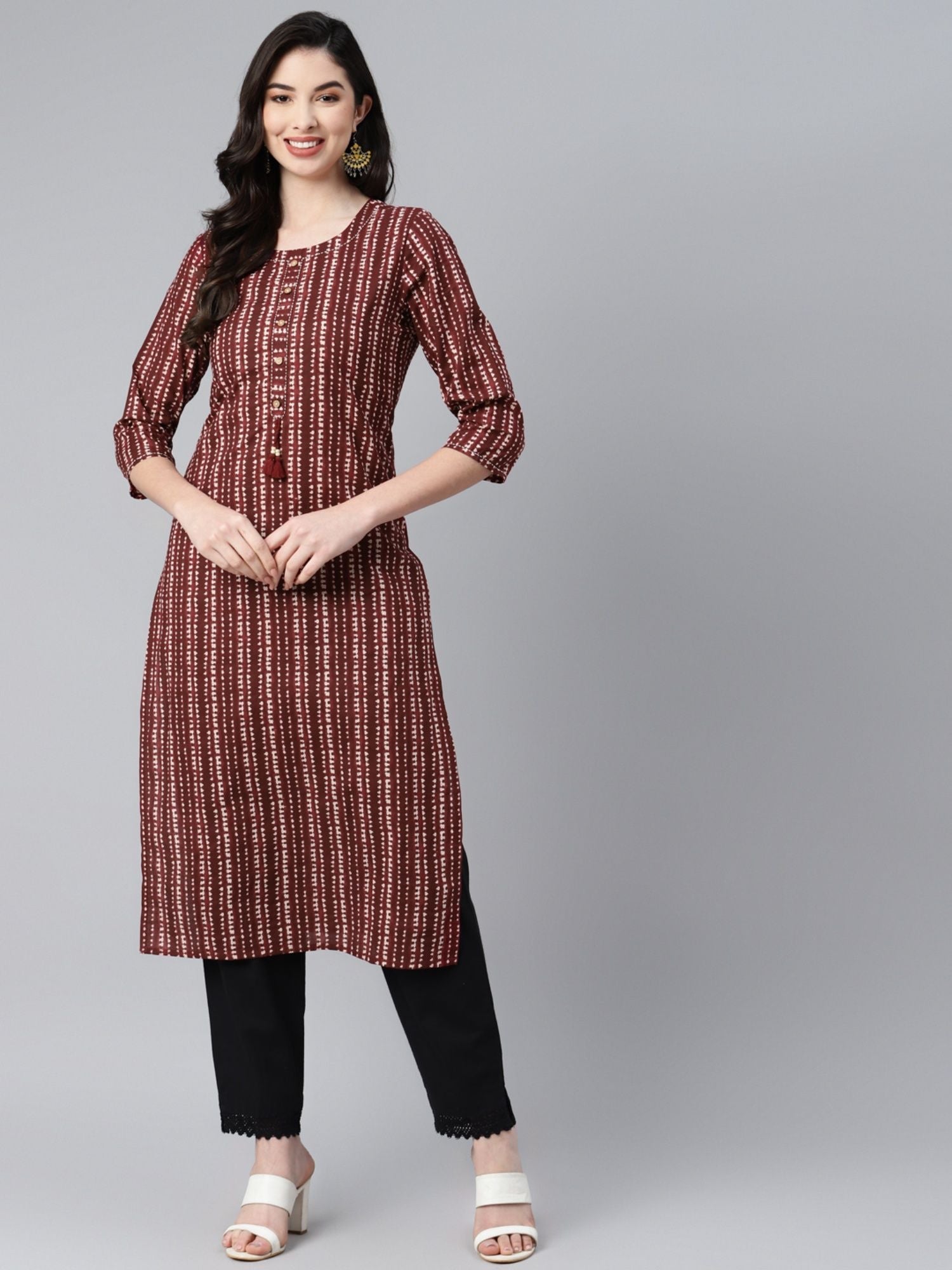 PIROH Women's Cotton Stripe Print Straight Kurta (Maroon)