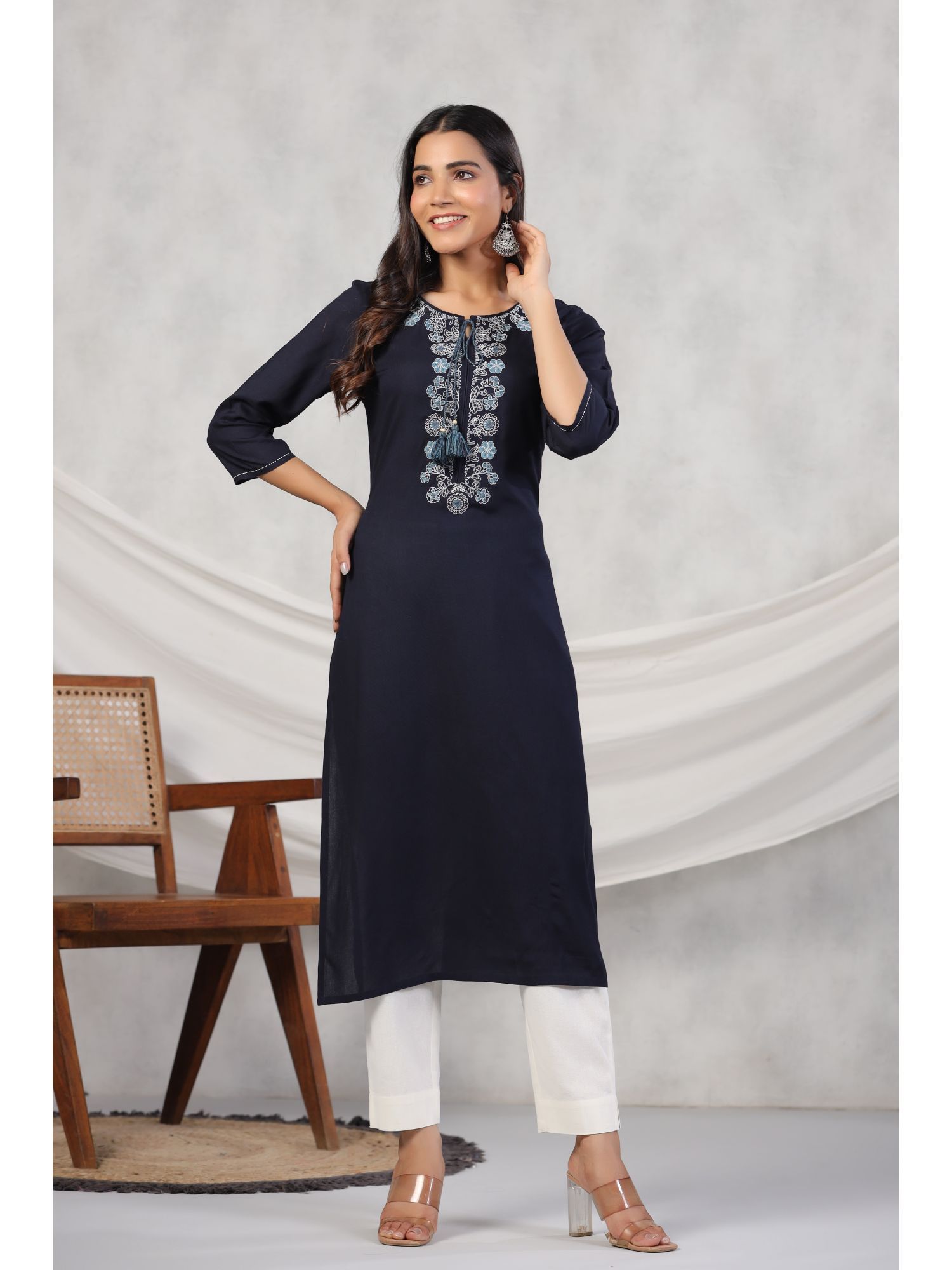 - Embrace casual elegance with Piroh's Navy Blue Solid Straight Ethnic Kurta, featuring a beautifully embroidered yoke and intricate details.