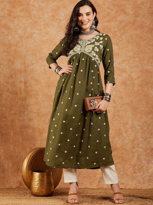 Sangria Floral Embroidered V-Neck Empire Anarkali Kurta