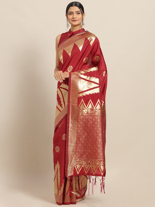 - Red and Gold-toned banarasi woven design saree with a zari border