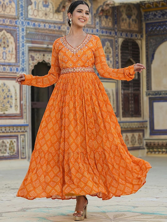 - A vibrant orange, yellow, and gold toned maxi ethnic dress with a stunning bandhani print, this dress features a flattering V-neckline, long regular sleeves, and a gathered detail.