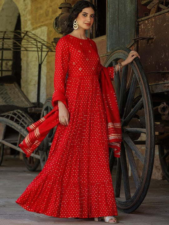 - Striking red tiered ethnic dress embellished with a fit and flared shape, round-neck, long regular sleeves, and a flared hem, complete with a zip closure, perfect for festive occasions.