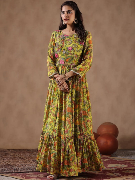 Scakhi Floral Printed Gathered Detail Chinon Silk Gown Maxi Length Ethnic Dress