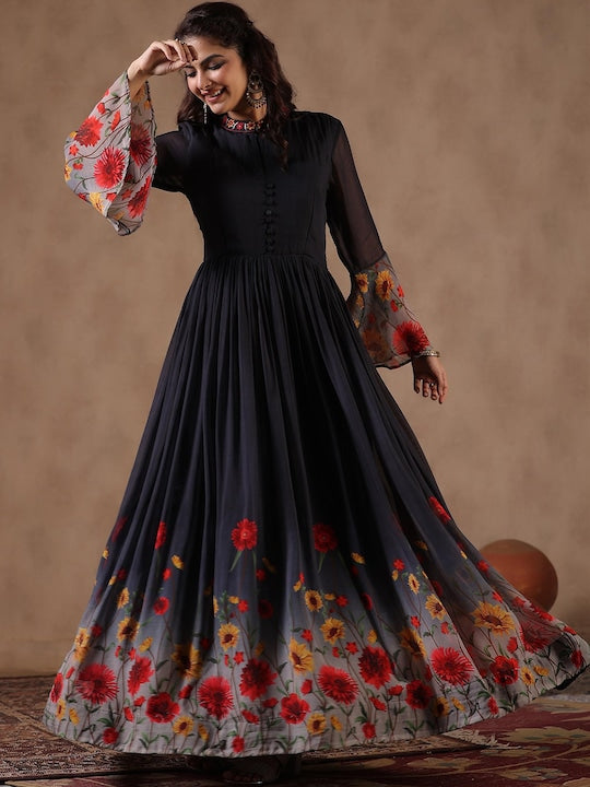- Elegant black ethnic dress adorned with a floral print, designed in a maxi shape with a mandarin collar and long bell sleeves, featuring a gathered waist and a flared hem.