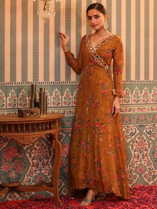 - A stunning gown-shaped ethnic dress in a vibrant mustard yellow, green, and red color palette, adorned with a beautiful floral print.