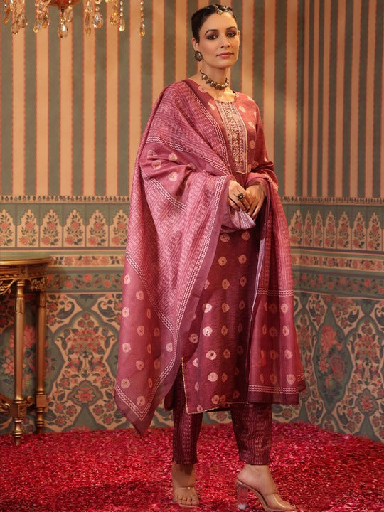 - Embrace your festive look with this mauve printed kurta paired with trousers and a dupatta. The straight-shaped kurta features quirky prints and gotta patti detail on chanderi silk machine weave fabric. It has a regular style, round neck, three-quarter regular sleeves, and calf-length straight hem, making it perfect for festive occasions.