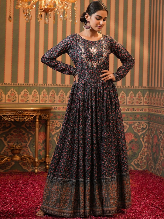 - A classic black Anarkali-shaped ethnic dress with a stunning floral print. This dress features a round neckline, short regular sleeves, and is ankle-length with a flared hem, creating a beautiful pleated style.