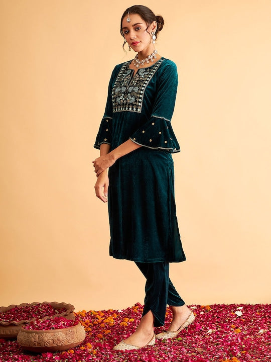 Shae by Sassafras Women Green & Golden Yoke Design Velvet Finish Straight Kurta