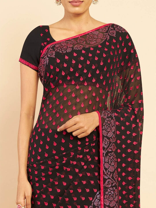 Soch Black & Red Floral Embroidered Pure Georgette Saree