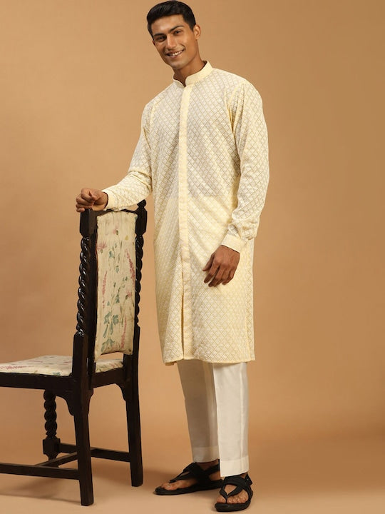 Vastramay Geometric Embroidered Mandarin Collar Chikankari Kurta With Pyjamas