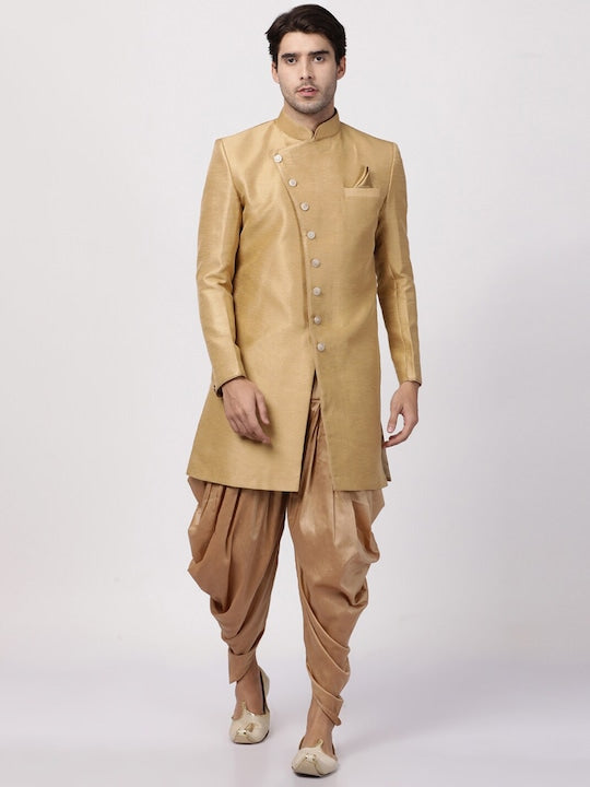Vastramay Men Beige & Rose Gold Coloured Angrakha Patterned Sherwani with Cowl Pattern Patiala Style Style Dhoti Pants