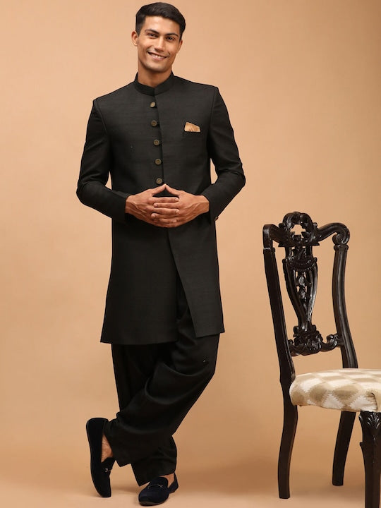 - Black solid sherwani, has a mandarin collar, full button placket, long sleeves and one welt pocket
