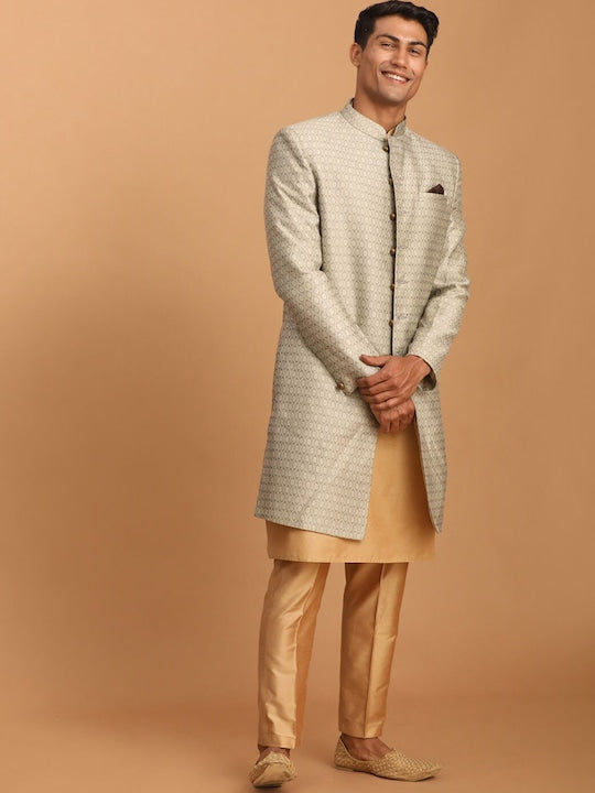 - Beige woven-designed sherwani, has a mandarin collar, stylised wrap-over front with button closures, long sleeves, one welt pocket and multiple slits