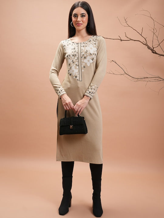 Vishudh Beige Floral Printed Long Sleeves Straight Kurta