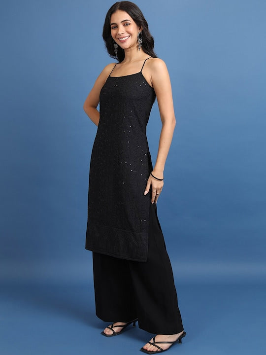 Vishudh Black Floral Embroidered Sequinned Straight Kurta