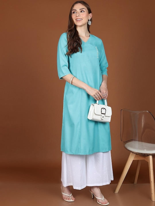 Vishudh Blue V-Neck A-Line Kurta