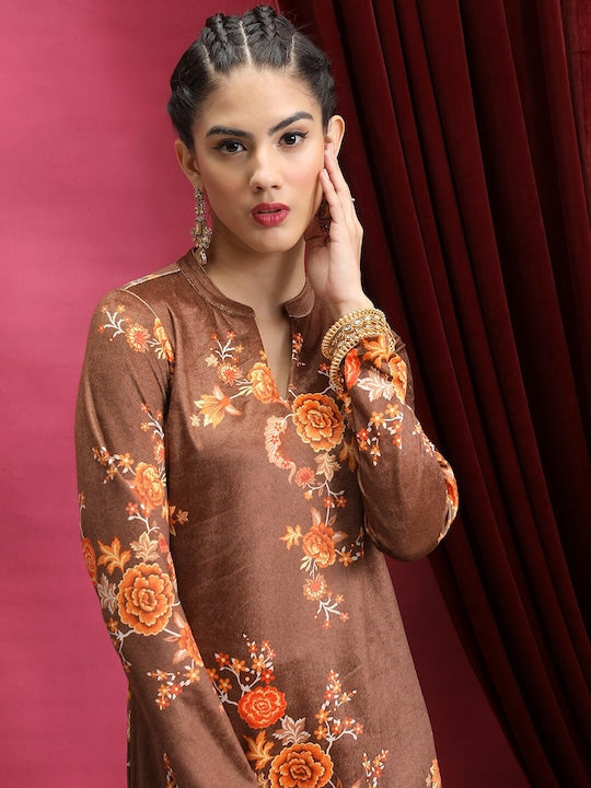 - Brown and orange floral printed A-line kurta with a V-neck and long, regular sleeves.