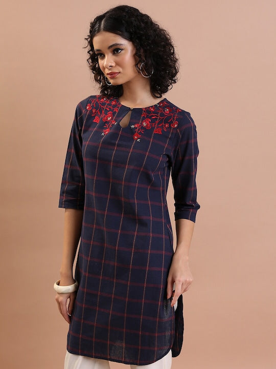 Vishudh Checked Thread Work Cotton Straight Kurta