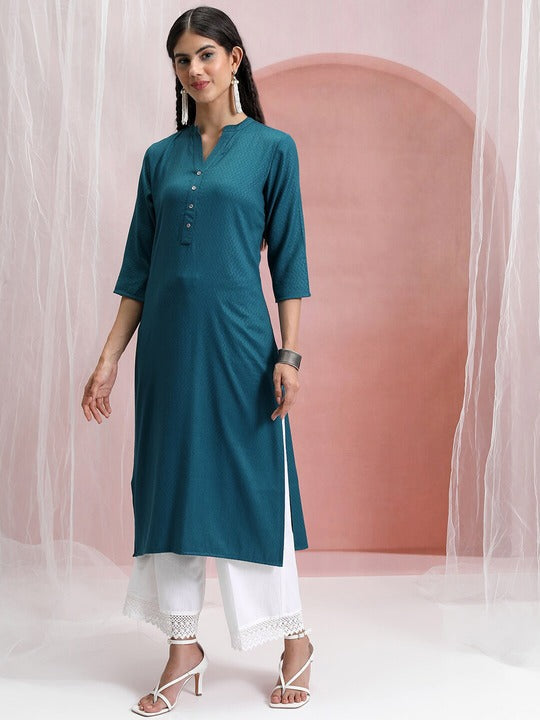 - Teal polyester-viscose kurta featuring a chevron woven design with a mandarin collar and three-quarter sleeves. It has a straight shape with a calf-length straight hem.
