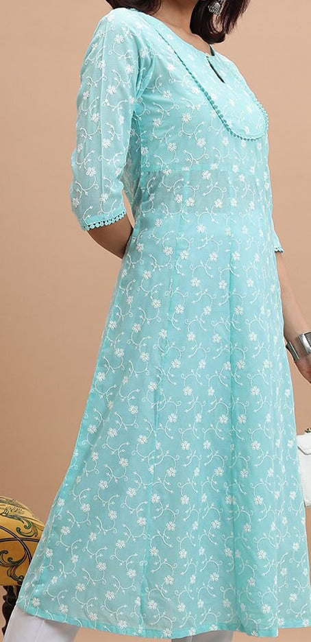 - Turquoise blue and white floral embroidered Anarkali kurta with a keyhole neck and three-quarter regular sleeves, exuding elegance and charm.