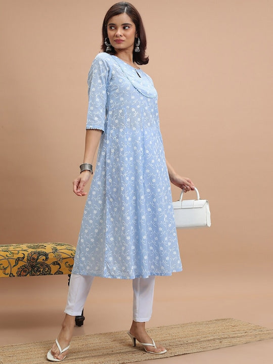 - Blue and white floral embroidered Anarkali kurta with a keyhole neck and three-quarter regular sleeves, exuding elegance and charm.