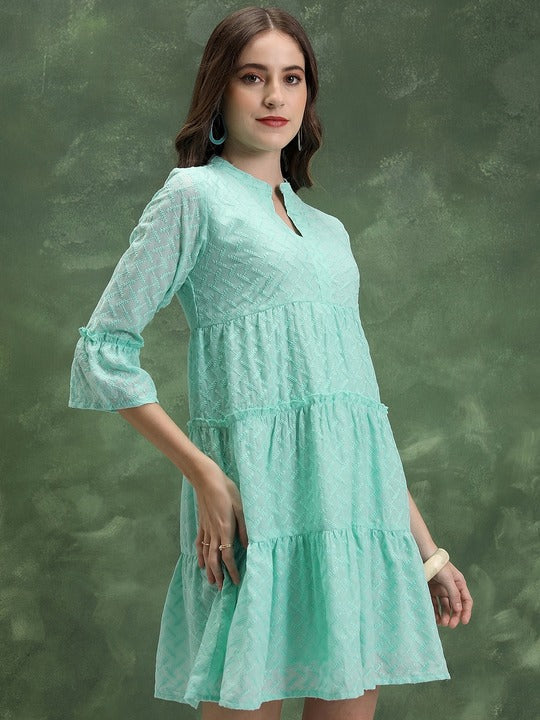 Vishudh Floral Embroidered Mandarin Collar Bell Sleeves Tiered Detail A-Line Mini Dress