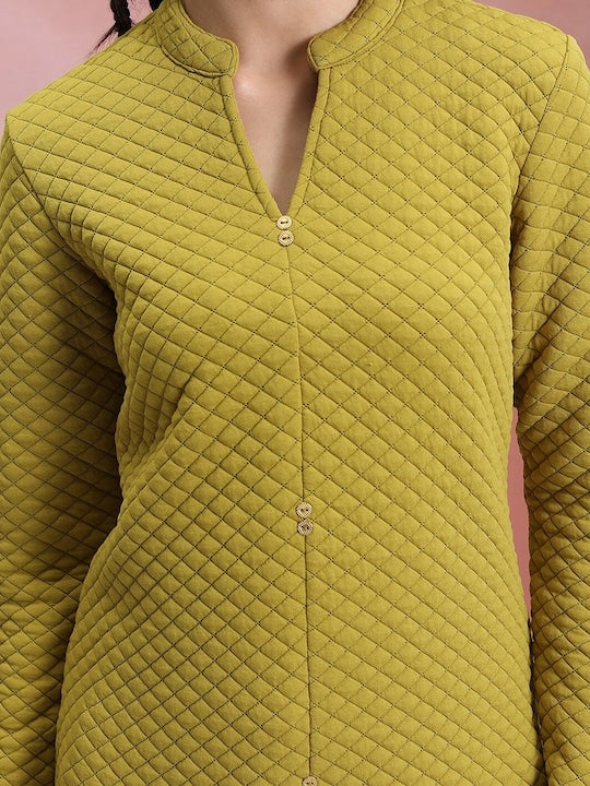 - Stylish olive green calf-length kurta featuring a geometric woven design and a mandarin collar, with long, regular sleeves and a flared hemline, suitable for festive occasions with its contemporary style.
