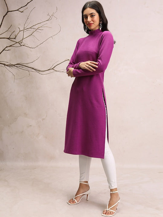 - Elevate your festive wardrobe with this elegant purple kurta featuring a high neck and long, regular sleeves for a sophisticated look.