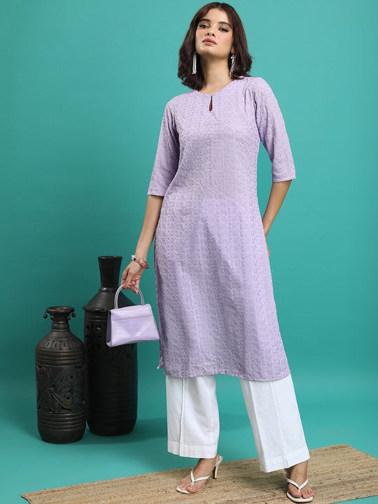 Vishudh Lavender Ethnic Motifs Embroidered Keyhole Neck Thread Work Straight Kurta