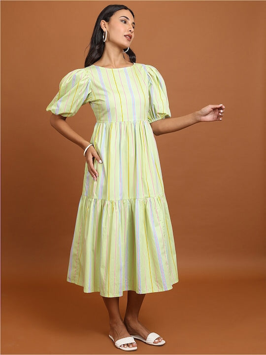 Vishudh Lime Green Striped Puff Sleeves Cotton Fit and Flare Midi Dress