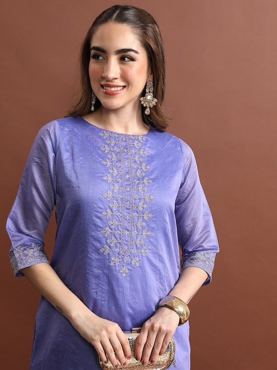 Vishudh Mauve Ethnic Motifs Embroidered Boat Neck Indigo Cotton Straight Kurta