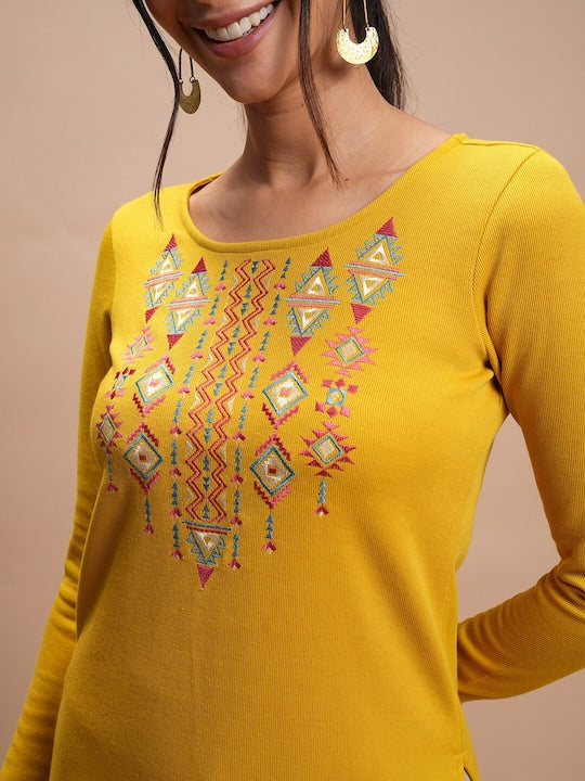 - Elevate your daily look with this mustard yellow kurta featuring ethnic motif embroidery and a round neck.