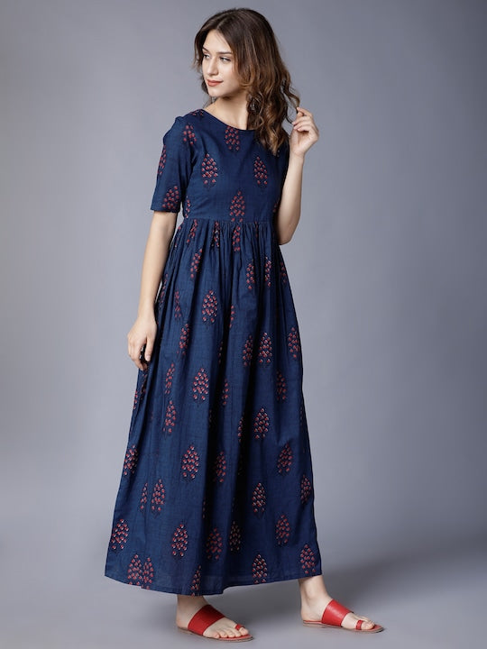 Vishudh Navy Blue Ethnic Motifs Printed Cotton Maxi Dress