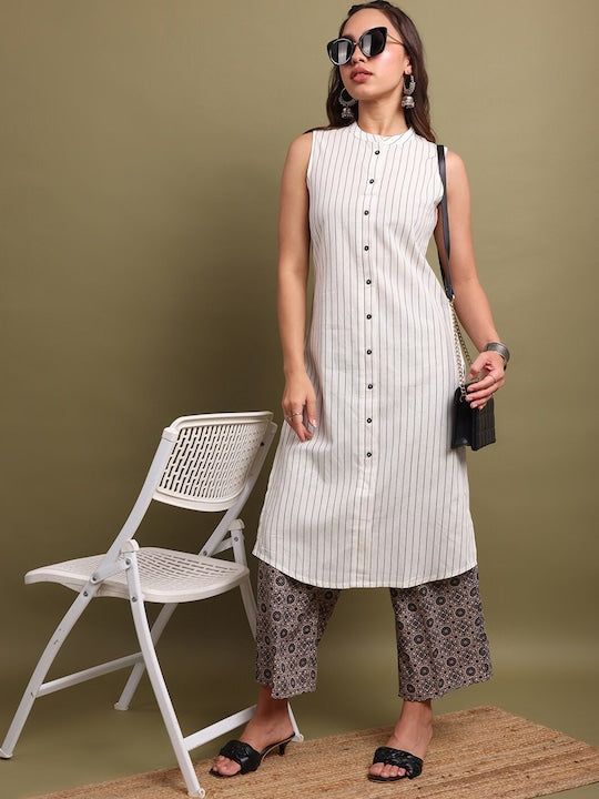 - Embrace casual elegance with this white calf-length dress featuring stripes, a round neck, and sleeveless design.