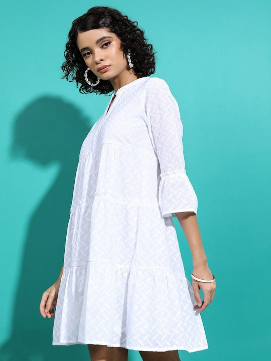 Vishudh White Embroidered Bell Sleeves Tiered A-Line Dress