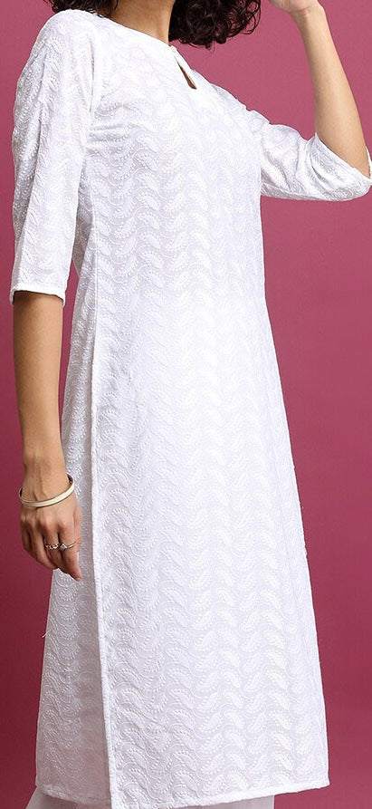 - White calf-length kurta with floral embroidery, featuring a keyhole neck and three-quarter sleeves for a festive look.