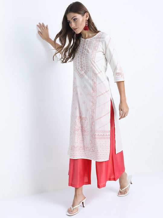 Vishudh Women Cream-Coloured Striped Thread Work Kurta