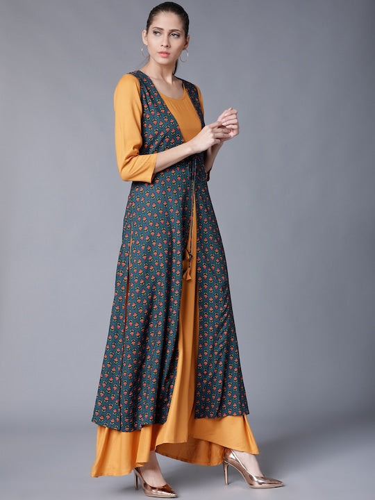 Vishudh Women Mustard Yellow & Teal Blue Printed Layered A-Line Kurta